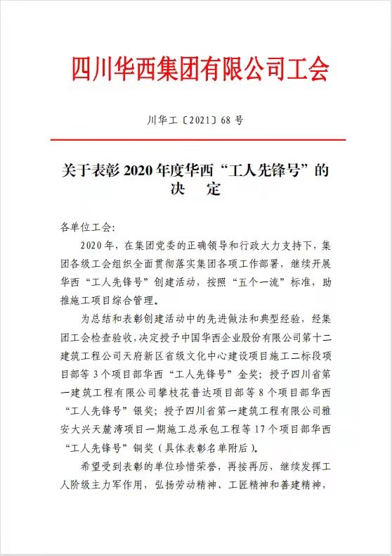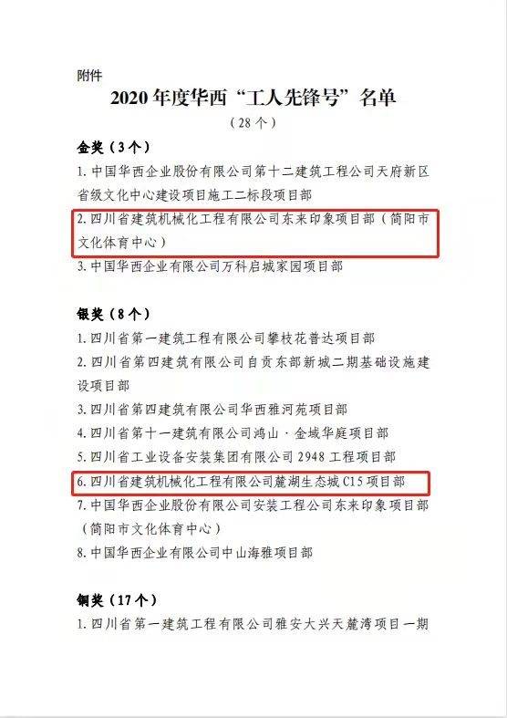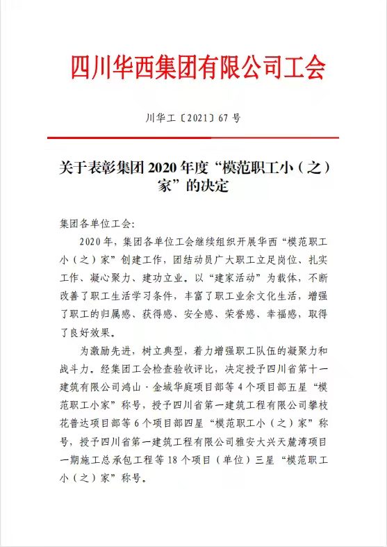 近日,集團傳來喜訊,經過評比驗收,集團工會決定授予四川機司東來印象項目部(簡陽市文化體育中心)“工人先鋒號”金獎、五星“模范職工小家”稱號;授予麓湖生態城C15項目部“工人先鋒號”銀獎、四星“模范職工小家”稱號;授予雙流正源國際薈產城融合項目一期項目部“工人先鋒號”銅獎、三星“模范職工小家”稱號。